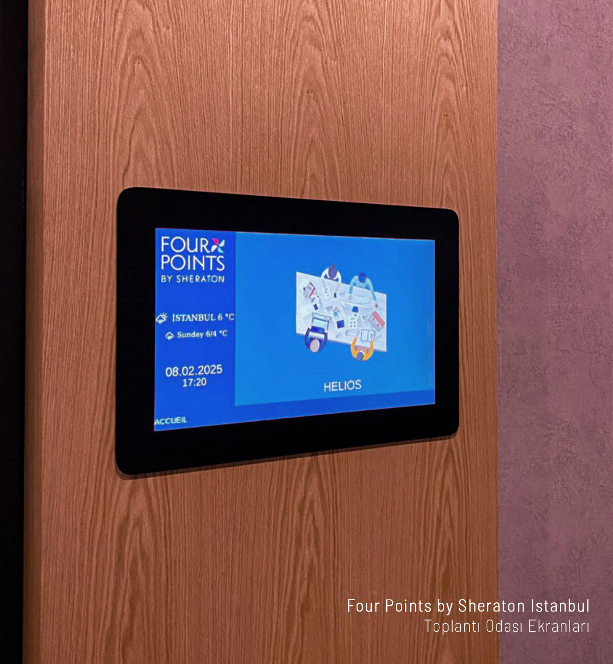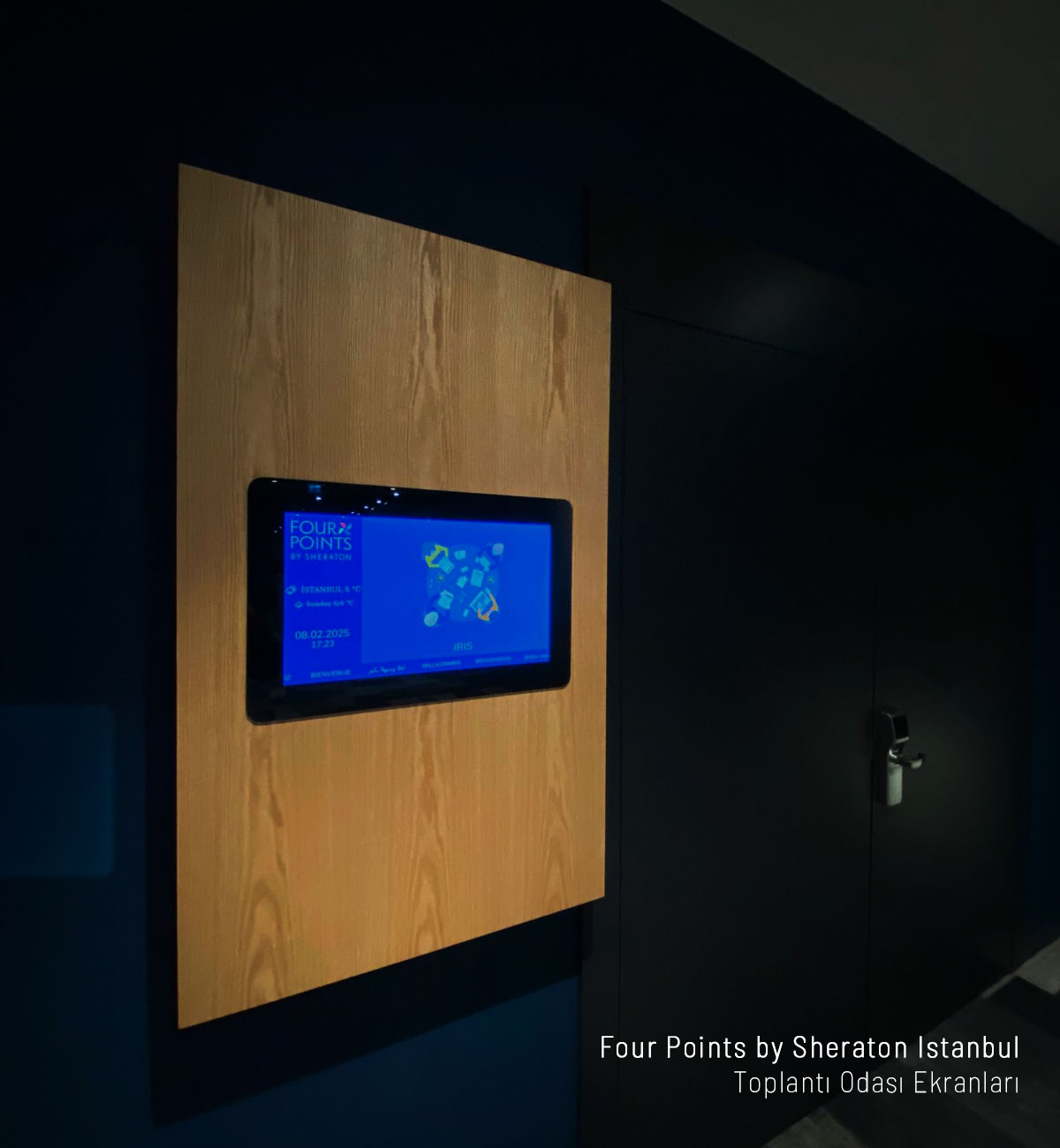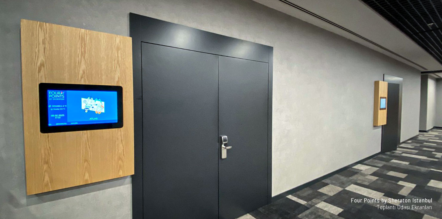 Teknius olarak Four Points by Sheraton Istanbul Pendik’de üstlendiğimiz proje kapsamında otelin toplantı alanlarında ziyaretçileri bilgilendirmek ve yönlendirmek amacıyla özel tasarımlı 22” kapı yanı ekranlar kullanıldı. Her biri toplantı salonunun girişine konumlandırılan bu 8 adet ekran, toplantıların başlangıç-bitiş saatlerini ve ziyaretçi yönlendirmelerini anlık olarak yansıtarak şık ve işlevsel bir dijital altyapı sağladı.